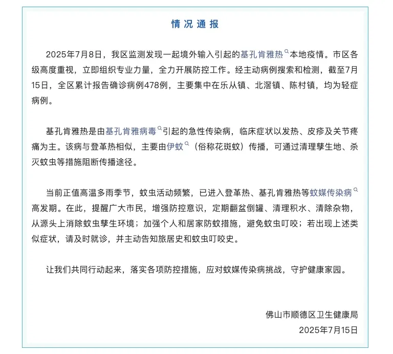 基孔肯雅热普遍存在于非洲、南亚和东南亚的热带与亚热带地区,其传染源主要为急性期患者、隐性感染者及感染病毒的非人灵长类动物。其潜伏期3-7天,且无特效疫苗,一旦本地传播,易短时间扩散,本次疫情即境外输入引发的本地传播。