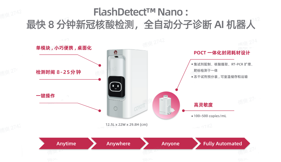 “闪测”Nano仅A4纸大小,搭配“采检一体”检测试剂卡盒,支持拭子直接采样上机,无需生物安全柜,能够大幅降低操作门槛及减少实验室建设的资金投入。