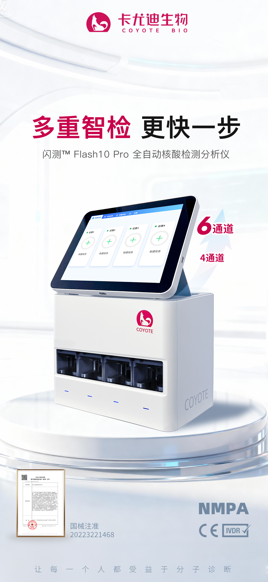 目前,“闪测”Flash10 Pro已正式获批国家药品监督管理局第三类医疗器械注册证(国械注准20223221468)。以更灵活、更高效、更精准的技术升级,为国内用户提供值得信赖的分子诊断解决方案。