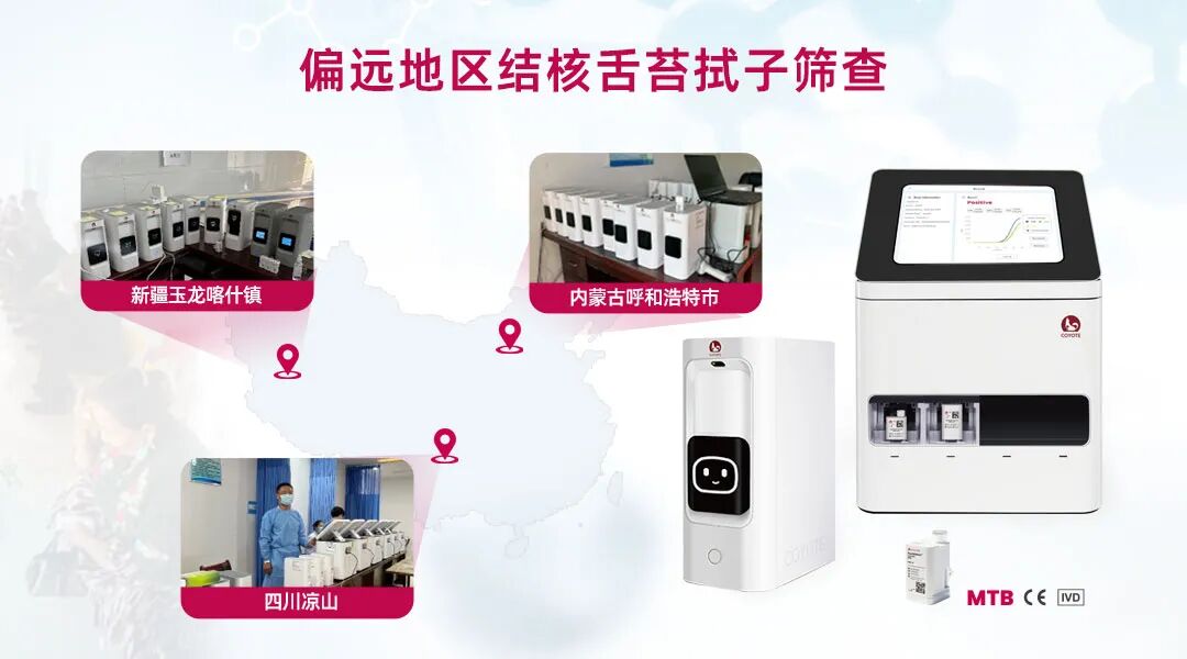 由北京胸科医院与卡尤迪共同研发的舌拭子无创快速结核分枝杆菌分子检测系统,在新疆、内蒙古和四川等地的医院及乡镇卫生院开展公益筛查,使偏远地区也具备了与中心实验室相媲美的分子诊断能力。