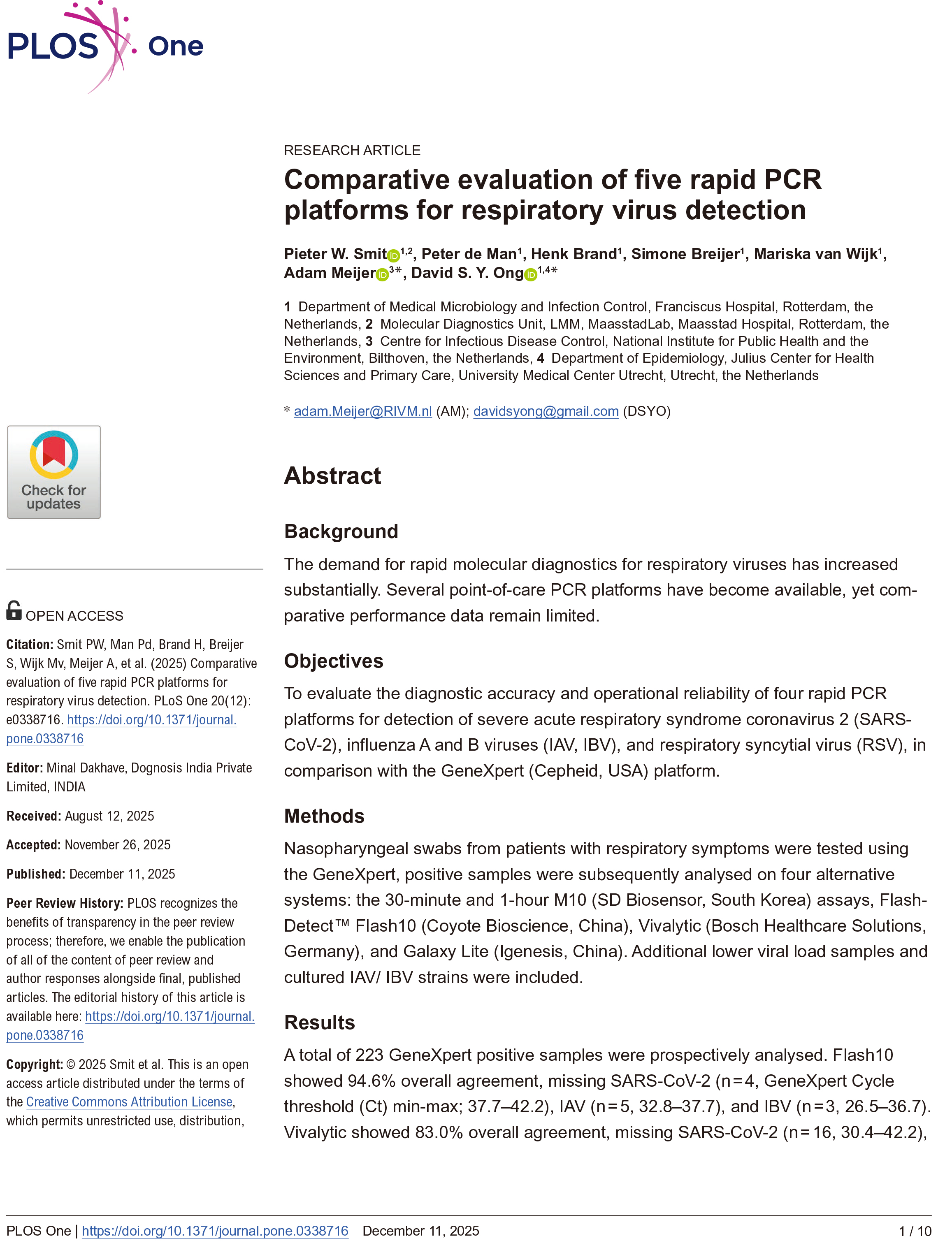 近日,国际权威学术期刊PLOS ONE发表了一项由荷兰鹿特丹弗朗西斯卡斯医院主导的临床研究。该研究对当前主流的五种快速PCR平台进行了系统比较。研究结果显示,卡尤迪生物的闪测™ Flash10平台在呼吸道病原体检测中,与业界金标准GeneXpert系统展现出94.6%的总体一致率,其卓越的准确性、稳定的操作性能及用户友好设计,为即时分子诊断提供了新的高效选择。