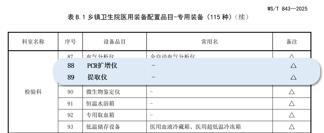 2025年3月29日,国家卫生健康委员会发布推荐性卫生行业标准《乡镇卫生院医用装备配置标准》,推荐乡镇卫生院检验科配备PCR扩增仪及提取仪,助力开展更多精准检测项目,为临床诊断提供有力支持。