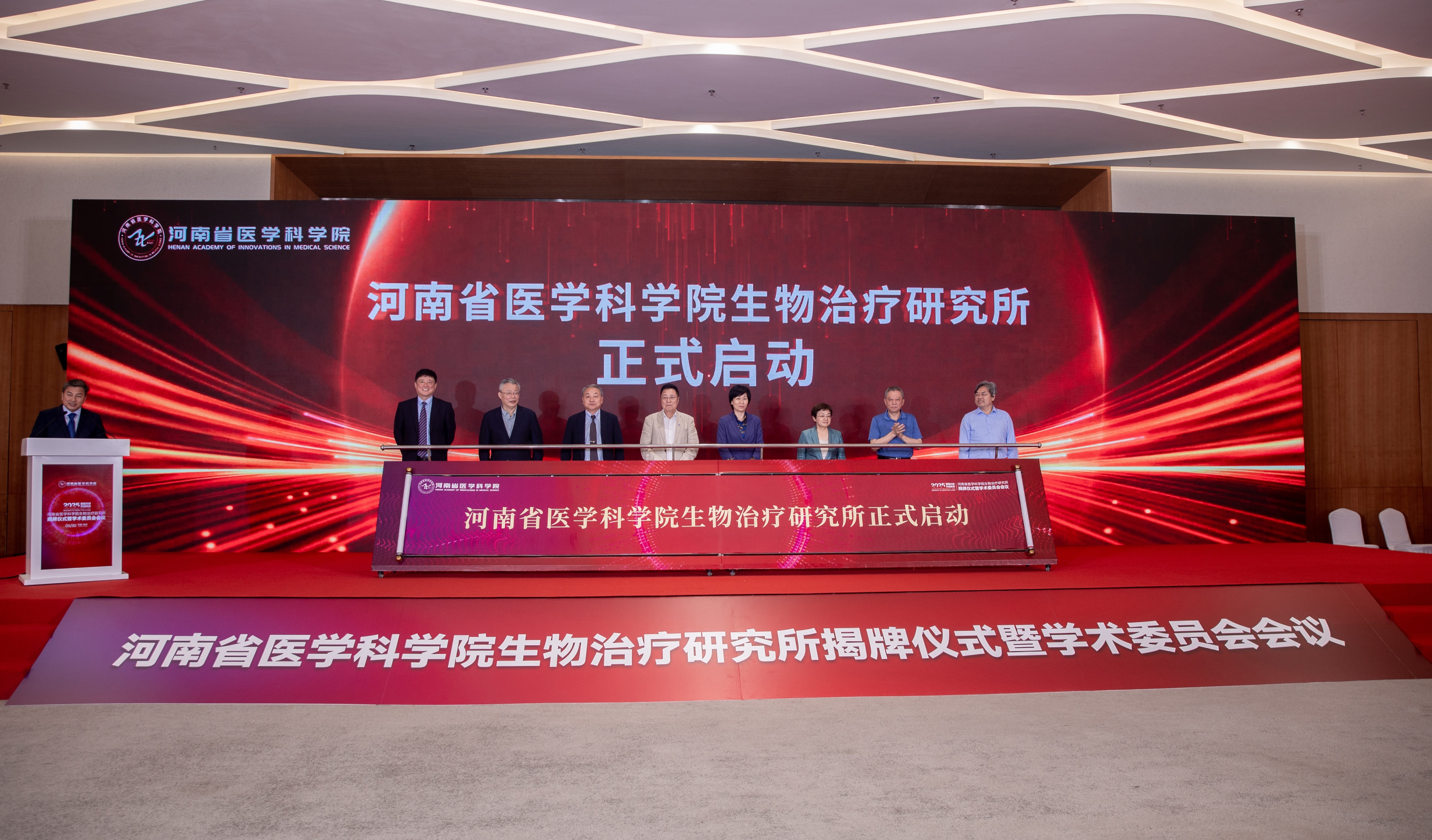 河南省卫生健康委党组副书记、副主任,省医学科学院党委书记侯红,河南省医学科学院院长王宁利教授,郑州市人民政府副市长李凤芝,河南省医学科学院生物治疗研究所所长杜杰教授,中国科学院院士顾宁教授、王松灵教授、王以政教授、谢道昕教授等领导与专家共同为生物治疗研究所揭牌。国内生物医学领域长江学者、国家杰青等顶尖专家与生物医药行业领军代表出席会议,共同见证这一里程碑时刻。