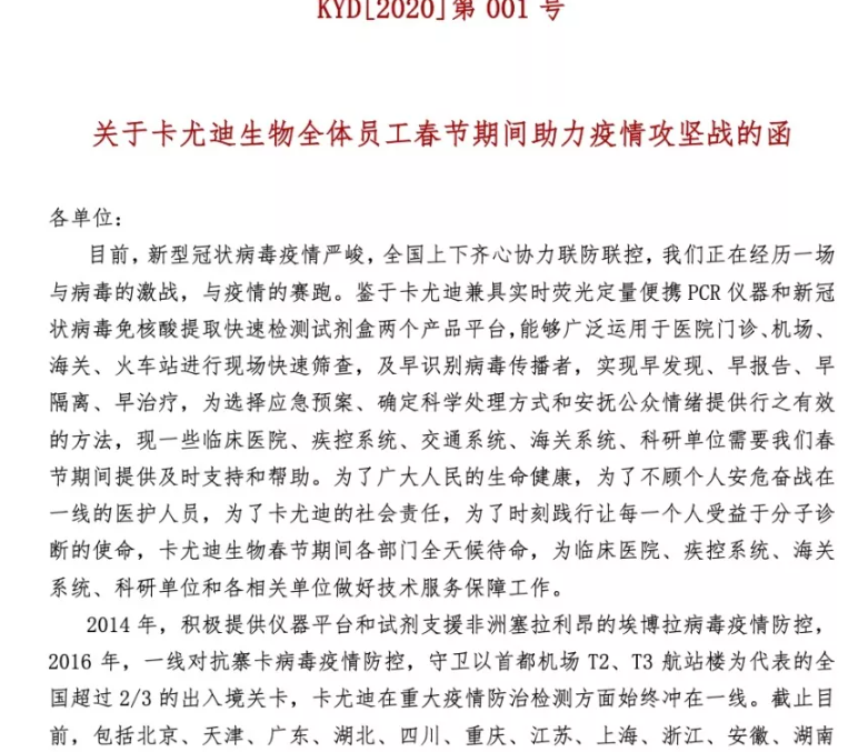 只有单体医院筛查量提升,才能把能够做检测的医院数量提升,这样就比较轻松的满足快速排查武汉超级传播者病人的需求,提高筛查覆盖面。卡尤迪快速全封闭核酸检测平台,助力武汉更早筛出“潜伏超级传播者”,我们已经做好准备,卡尤迪生物科技在北京以及武汉的同事们将在春节期间随时待命,无条件援助武汉及周围需要帮助的人们!