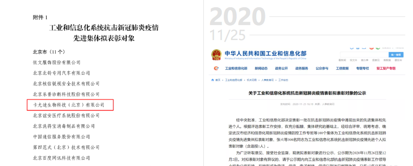 经中央批准11月25日工业和信息化部公示在抗击新冠肺炎疫情中涌现出来的先进集体和先进个人,其中卡尤迪生物凭借战疫中的优秀表现及创新技术研发成为“先进集体”拟表彰对象。